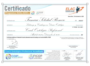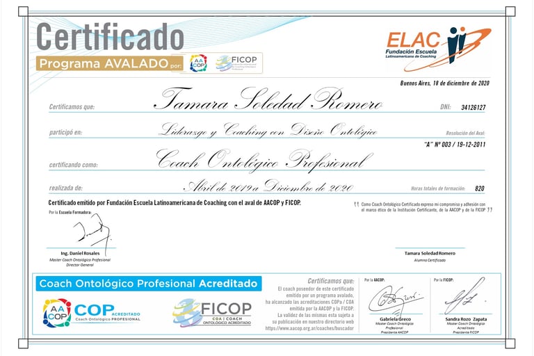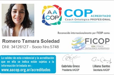 Mi nombre es Tamara Soledad Romero, soy Coach Ontológico Profesional. Me formé en la Escuela Latinoamericana de Coaching (ELAC). Soy Coach certificada por la AACOP (Nº 5748 - Link al perfil) y por la FICOP. Actualmente me encuentro realizando la acreditación en la ICF.